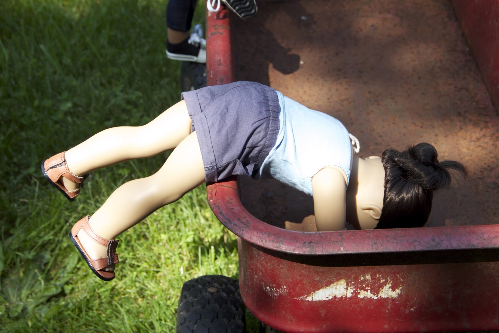 Rylan had finally managed to drag her housemates outside to enjoy the morning sunshine, and while wandering sleepily around the yard Lilly discovered a large red vehicle lying on it's side. She called the rest of the girls over. (Who were admiring the rose garden, which was just starting to bloom {It was really just Rylan doing the admiring- Andie and Kaya were sprawled on the grass trying to go back to sleep. Perhaps it was too early in the morning.}) The strangeness of the object, when they gathered around it, inspired further inspection.